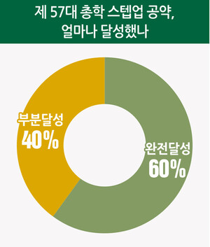 제57대 총학생회 스텝업의 임기 종료까지 약 50일이 남은 현재 공약 달성률은 60%다. 완전히 이행한 공약은 24개, 이행했으나 완전히 달성되지는 못한 공약은 16개, 미이행 공약은 0개다. 총학생회(총학)은 △등록금 부담 완화 △수업권 개선 △대외 이미지 제고 △시설·생활환경 개선 △소통 강화 △고시·진로 지원 △문화 활동 증진 △권리·연대 실현을 포함한 정책에 40개 공약을 내걸며 출범했다. 본지는 총학의 선본 당시 정책 자료집을 바탕으로 공약 달성을 평가했다. 기사 발행 시기를 기준으로 완벽하게 달성된 공약만을 기준으로 공약