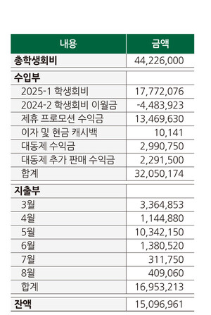 제57대 총학생회 스텝업(총학)의 2025학년도 1학기 사업비 결산 결과, 약 1500만 원의 흑자가 발생했다. 2024학년도 2학기 사업비 결산상 적자가 있었으나, 지난 학기 진행된 제휴 프로모션을 통해 만회했다. 올해 상반기 학생회비를 포함해 수입은 약 3200만 원, 지출은 약 1700만 원이다. 작년 하반기보다 수익은 늘고 지출은 줄었다. 2024학년도 2학기(24-2학기) 총학 사업비는 약 450만 원 적자가 발생했으나, 2025학년도 1학기(25-1학기) 제휴 프로모션 수입 약 1350만 원으로 상환했다. 총학생회비 납부