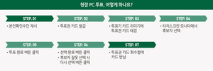 25일(월)부터 시작하는 제18대 총장선거는 현장 PC 투표로 진행된다. 현장 PC 투표 진행 방식은 다음과 같으며 예상 소요 시간은 3분 내외다. 선거권자는 투표 장소에 방문해 본인확인수단 제시 후 투표권 카드를 발급받는다. 투표기와 연결된 카드 리더기에 카드를 올리면 투표기 터치스크린이 투표 화면으로 전환된다. 후보 선택 후 하단 투표 완료 버튼을 누르면, 선택 완료 버튼과 다시 선택 버튼이 제시된다. 잘못 선택한 경우 다시 선택 버튼을 눌러 선택을 정정하면 된다. 투표를 마치고 기표소에서 나와 투표권 카드 회수함에 카드를 반납