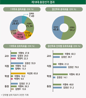 11월27일(수) 이향숙 교수(수학과)가 제18대 총장선거 결선투표에서 김정선 교수(사회학과)를 상대로 역전승했다. 11월25일~26일 진행된 1차투표에서는 김정선 교수 28.7%, 이향숙 교수 25.3% 총득표율을 기록하며 김정선 교수가 3.4%p 앞섰다. 하지만 결선투표에서 이향숙 교수가 54.2%, 김정선 교수가 45.8%를 득표하며 이향숙 교수가 8.4%p 차이로 승리를 거뒀다. 두 후보를 지지하는 구성단위가 달라 마지막까지 예측이 어려웠던 이번 선거의 핵심은 교수와 학생 표심이었다. 교수와 학생의 압도적인 지지가 승리로교수