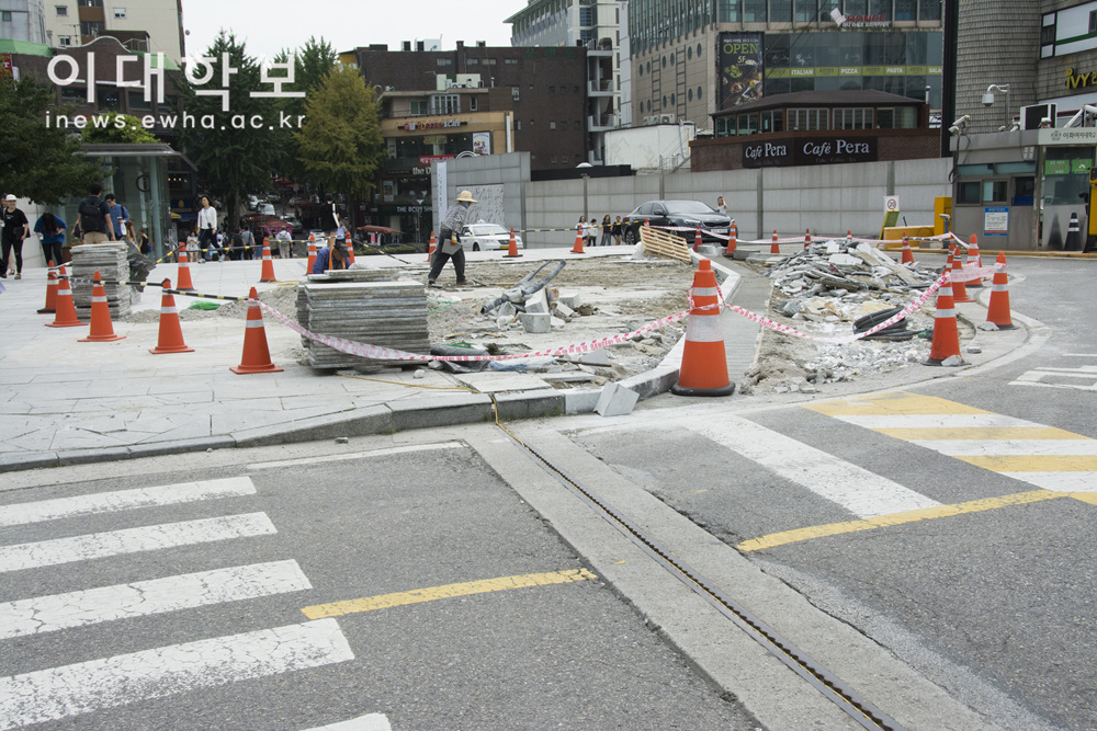 공사를 총괄하는 시설팀 강성기 대리는 “대형 차량이 지나가면서 보도의 석재가 깨진 것일 뿐, 지반의 영향은 절대 없다”고 말했다.