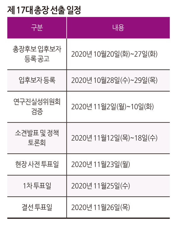 제17대 총장 선거 세부 일정이 1차 선거관리위원회(선관위)에서 결정됐다. 총장 후보 선출은 10월28일(수)~29일(목) 입후보자 등록부터 11월23일(월)~26일(목) 투표일까지 약 한 달에 걸쳐 진행될 예정이다. 이 기간에 연구진실성위원회와 정책토론회 등이 열린다.