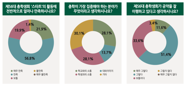 설문 결과 재학생 10명 중 약 8명이 총학의 활동을 긍정적으로 평가했다. 대동제 운영과 같은 문화사업과 상반기 교육공동행동 실시, 총장 간담회 성사 등 학교와의 소통을 높게 평가한 학생이 많았다.