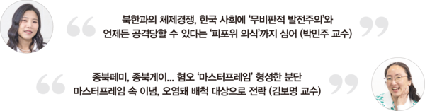 두 교수는 21세기 한국에서 분단으로 인해 두드러지는 현상에 공통적으로 ‘혐오’라고 답했다. 박 교수는 미국 철학자 마사 누스바움의 말을 인용하며 “혐오라는 감정은 갈등 상황에서 적에 대한 불안감을 잊기 위해 발생한다”고 설명했다. 북한은 가까이 있지만 실제로 체감하기는 어렵기에, 그에 대한 혐오는 주변의 다른 존재에게 투영된다. 김 교수는 분단 이후 전쟁은 한국 사회 내부에서 벌어지고 있다며 “남한의 서로 다른 존재들끼리 싸우고 있는 것”이라고 말했다. ‘가족을 망하게 할’ 퀴어 혹은 페미니스트, 이주민과 중국인까지, 분단은 내부의 적을 끊임없이 만들어내고 있다.