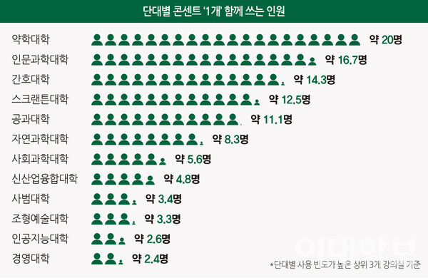 본지는 이번 학기 강의계획서 기준 사용 빈도가 높은 강의실을 단과대학별로 3순위까지 도출해, 3월21일, 29일, 31일 강의실 내 콘센트 수를 조사했다. 조사 결과, 약학대학과 인문과학대학은 각각 약 20명, 약 17명이 콘센트 1개를 함께 쓰는 것으로 집계됐다. 콘센트 한 개에 대한 학생 밀집률이 가장 낮았던 경영대학조차 2.4명으로, 1명이 콘센트 하나를 온전히 쓸 수 없었다. 음악대학 건물의 경우, 사용 빈도가 가장 높은 세 강의실(국악합주실, 관현악실, 국악관현악실)에 각각 8개, 10개, 3개의 콘센트가 설치돼 있었다.