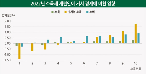 석 교수 연구 결과, 소득세 개편안으로 GDP는 2022년 대비 0.45% 증가하고, 조세 수입은 정부 예측치보다 적은 폭으로 감소하는 긍정적인 효과가 발생했다. GDP 증가로 가구의 소득이 증가했고, 고소득자가 세금을 덜 내면서 소비를 늘려 과세 기반이 넓어졌기 때문이다. 더불어 기업 투자도 증가해 축적된 자본이 늘어나면서 실질 임금이 높아졌고, 결과적으로 국내총생산이 증가했다. 내수가 진작되는 경제적 효과를 얻은 것이다.