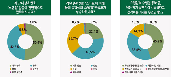 제57대 총학생회 ‘스텝업’(스텝업)이 임기의 절반을 마쳤다. 본지는 5월20일~5월28일 재학생 208명을 대상으로 스텝업의 임기 절반 활동에 대한 만족도 조사를 진행했다. 조사 결과 스텝업 활동에 대한 전반적인 만족도는 매우 만족(51%)과 만족(42.3%)을 더해 93.3%를 기록했다.