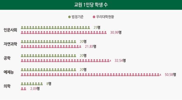 대학설립운영규정 제6조 1항 별표5에 따르면 교원 1인당 학생 수는 △인문사회 계열의 경우 25명 △자연과학 계열 20명 △공학 계열 20명 △예체능 계열 20명 △의학 계열 8명을 기준으로 삼는다. 2024년 기준 우리대학의 ◆전임교원 1인당 재학생 수는 △인문사회 계열 31명 △자연과학 계열 21.8명 △공학 계열 32.5명 △예체능 계열 50.6명 △의학 계열 2.1명이다. 의학 계열을 제외한 모든 계열에서 법정 기준에 미치지 못했다. 우리대학의 전체 평균 전임교원 1인당 재학생 수는 25.4명으로, 전국 대학 평균인 23.3명보다 높은 편이다. 교원 1인당 학생 수가 많아지면 교원과 학생 간 긴밀한 상호작용이 어려워지고 교육의 질이 저하될 가능성이 높다.