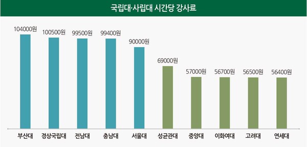대학알리미 대학정보공시에 따르면 2024년 기준 전국 국립대의 시간당 강사료는 평균적으로 9~10만원을 웃돈다. 사립대 사정은 다르다. 서울시내 사립대의 시간당 강사료는 5~6만원 선이다. 노조가 설치돼 임금이 가장 높은 성균관대가 6만9000원을 지급하고 있다.