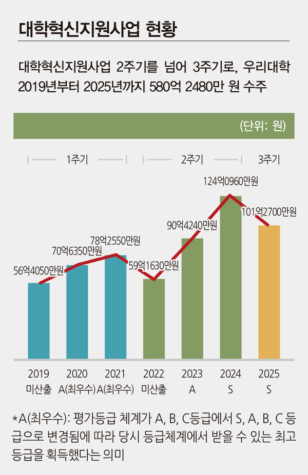 우리대학은 대학혁신지원사업 2주기에 긍정적 성과를 보였으나, 성과 이면에는 극복해야 할 과제도 존재했다. 재정적 성과는 분명했지만 갑작스러운 글로벌프론티어 일시 중단, 무리한 학제 개편 등으로 학생과의 소통은 여전히 과제로 남는다는 비판이 나온다. 3주기를 S등급으로 시작한 만큼 안정적인 혁신을 이어갈 수 있을지 귀추가 주목된다.