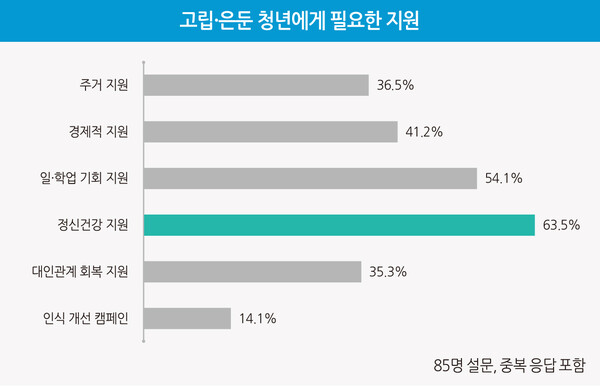 20대 청년들은 고립·은둔 청년에게 가장 필요한 지원 정책으로 ‘정신건강 지원’을 꼽는다. 그러나 현존하는 정신건강 지원 정책들은 그 효용에 대한 의문이 제기된다. 본지의 ‘청년 고립·은둔 경험과 사회적 원인에 대한 설문’에 따르면, 응답자의 63.5%가 고립·은둔 청년에게 심리 상담, 정신건강 치료, 치유 프로그램 등의 지원을 제공해야 한다고 답했다. 니트오피스 참여자 ㄷ씨는 거의 매년 참여한 마음건강 지원사업의 상담 프로그램이 단기적으로 진행되기에, 큰 변화를 기대하기는 어렵다고 토로했다. 상담자가 본인과 맞지 않는 것을 알아도 “새로운 상담자에게 가서 자신의 이야기를 해야 하는 상황이 부담된다”라고 덧붙였다.