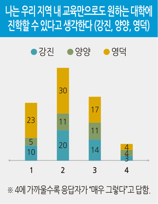 본지 설문조사에 따르면, ‘우리 지역 내 교육만으로도 원하는 대학에 진학할 수 있다고 생각한다’는 질문에 4점 척도 중 1·2점을 택한 청소년은 세 지역 모두 절반을 넘어섰다. 특히 영덕의 경우, 응답자의 71.6%가 부정적 응답을 내놓았다. 교육 기회에 대한 불만도 컸다. ‘우리 지역 교육이 예체능, 진로 탐색에는 다양하지 않다’는 질문에 영덕은 응답자의 82.4%가, 강진과 양양은 각각 63.8%와 64.5%가 동의(3·4점 응답)한 것으로 나타났다. 이는 청소년들이 지역 내 교육만으로는 대학 입시는 물론, 폭넓은 교육 기회를 쉽게 보장받지 못한다고 느낀다는 점을 보여준다.
