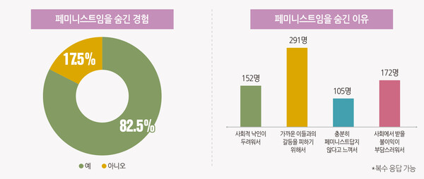 페미니스트 정체성을 드러내지 않는 가장 큰 이유는 사회에 어울리기 위함이었다. ‘가까운 이들과의 갈등을 피하기 위해’(73.3%), ‘사회에서 받을 불이익이 부담스러워서’(43.3%), ‘사회적 낙인이 두려워서’(38.3%)가 가장 큰 원인으로 꼽혔다. 이는 정체성 공개에 따른 사회적 불화를 꺼리는 것을 시사한다. 일각에서는 페미니스트임을 밝혔을 때 설명해야 할 것이 많아 귀찮고 피로하다는 목소리도 있었다. ㄱ씨는 페미니즘을 “‘극단적 여성우월주의’로 여기는 가족들과 자신 간의 간극을 메우기 위해 긴 대화를 하는 것이 피로하다고 느꼈다”며 “가족들에게는 페미니즘 이야기를 하지 않는다”고 답했다. ㄱ씨는 신원이 특정될 것을 우려해 익명을 요청했다.