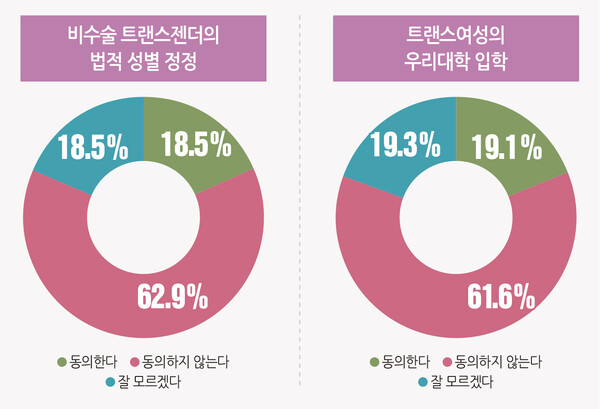 설문 결과 우리대학 학생 10명 중 6명이 트랜스젠더 의제에 반대하는 것으로 나타났다. 응답자들은 ‘비수술 트랜스젠더의 법적 성별 정정을 허가하는 판례에 동의하는지’, ‘트랜스여성(MTF)의 우리대학 입학에 동의하는지’ 2가지 질문에 답했다. 각 의제에 반대 의사를 보인 이들은 공통적으로 약 60%였고, ‘동의한다’고 답한 이들은 약 20%였다. 나머지 20%는 '잘 모르겠다'를 선택했다.