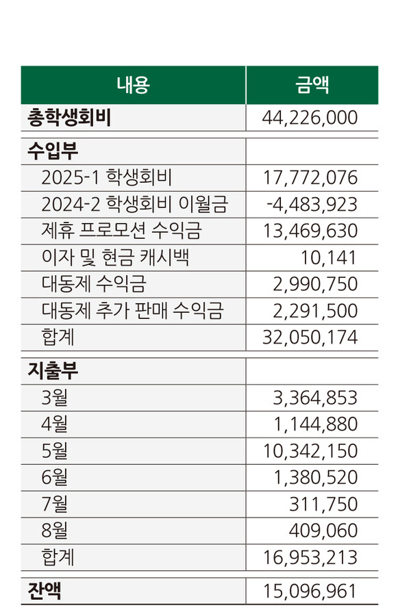 한편, 총학은 25-1학기 총수입부에서 ‘2024학년도 이월금’ 상의 오기재를 발견해 정정 사항을 전했다. 9월 8일 중앙운영위원회에서 해설 및 사과 후 총수입부를 재인준했으며, 16개의 모든 단과대학 운영위원회에 방문해 학과 대표자에게 해설 후 검토를 받았다고 밝혔다. 총학은 “이월금 오기를 수정하는 과정에서 오기입, 오기재 등 수정사항을 정비하고 단과대학, 학과, 학부 대표들의 의견을 바탕으로 재인준을 완료했다”며 “향후 총학생회 결산 작성 시 오기재 혹은 기재 누락 등이 발생하지 않도록 인수인계를 진행하겠다”고 덧붙였다.