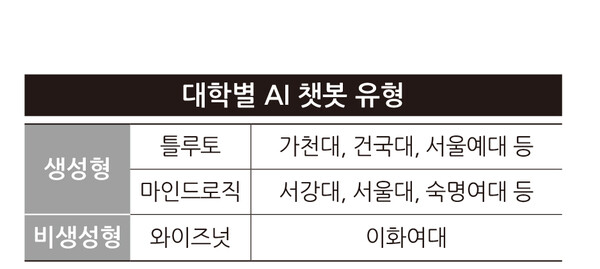 △숙명여대 △서강대 △서울대 등 약 30개 대학에서는 마인드로직의 챗봇 ‘팩트챗’과 ’인포미’를 도입해 사용 중이다. 마인드로직은 챗봇에 각 대학의 홈페이지 내용을 모두 숙지시켜 이용자에게 안내하는 등의 서비스를 제공한다. △가천대 △건국대 △서울예대 등의 도서관에서는 틀루토의 연구 보조 챗봇 틀루토 코파일럿이 활용되고 있다. 코파일럿은 학술 논문을 기반으로 연구 전반에 도움을 제공하며 대학 및 기관에 특화된 일반 질문에도 답변하는 챗봇이다.