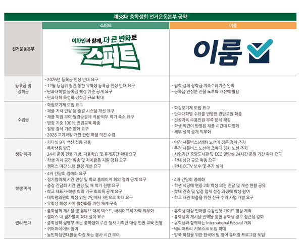 편집자주|우리대학 제58대 총학생회 선거운동본부(선본) 스퍼트와 이룸의 정책자료집이 공개됐다. 본지는 정책자료집을 바탕으로 공약을 분석해 그들이 내놓은 내년 청사진을 살펴봤다. 학내에서 지속적으로 제기되는 논의를 담은 공약을 중심으로 선별해 비교했다. 각 선본의 세부적인 공약은 총학생회 인스타그램 게시물 및 교내에 비치된 정책자료집을 통해 확인할 수 있다.